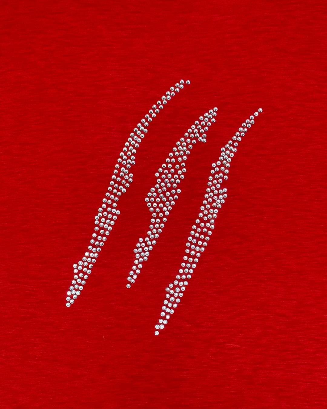 フロントには「爪痕」を思わせるようなスリット状のグラフィックが、ラインストーン風のプリントで表現され、赤いボディに強烈なコントラストを生み出しています。シンプルなシルエットながら、アート的でエッジの効いたデザインが際立ち、スタイリングの主役として活躍する一着。