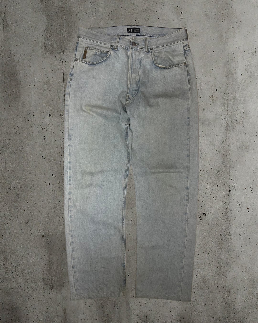 90sムード漂う「AJ ARMANI JEANS」のヴィンテージデニム。程よくフェードしたライトブルーに、メタルロゴやレザーパッチなどクラシックなディテールが映える一本。ストレートなシルエットは現代のスタイルにも合わせやすく。日本製の丁寧な仕立ても魅力です。
